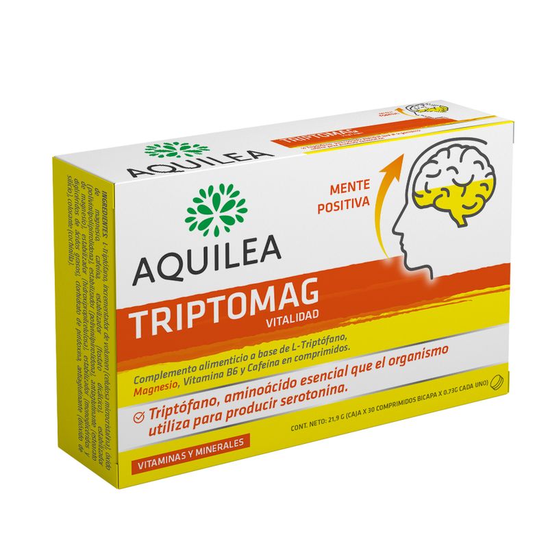 ESPECIFICACIONES: Aquilea Triptomag Vitalidad es un complemento alimenticio diseñado para ayudarte a mantener una mente positiva y combatir el cansancio. Se presenta en una caja con 30 comprimidos bicapa. Es fácil de incorporar a tu rutina: solo necesitas tomar 1 comprimido una vez al día por las mañanas para empezar el día con el ánimo necesario. Esta dosis está pensada para brindarte un aporte sostenido de sus ingredientes clave justo cuando más los necesitas. INDICACIONES O CONTRAINDICACIONES: Este producto está indicado para cualquier persona que busque apoyar su estado de ánimo y reducir la fatiga en su día a día. Es especialmente útil en épocas de mayor estrés, exámenes o cuando sientes un bajón de vitalidad. No es un medicamento, sino un suplemento que ayuda a la función psicológica normal. Como precaución general, no debe usarse como sustituto de una dieta variada y equilibrada, y se recomienda no superar la dosis diaria aconsejada. Si tienes alguna condición médica preexistente, es mejor consultar a un profesional de la salud. PRINCIPIOS ACTIVOS: Su fórmula avanzada combina L-Triptófano: Un aminoácido esencial que tu cuerpo utiliza como materia prima para producir serotonina, el neurotransmisor conocido como la "hormona de la felicidad", clave para regular el estado de ánimo; y Vitamina B6: Esencial para el correcto metabolismo de las proteínas (incluyendo el triptófano) y para la función psicológica normal.