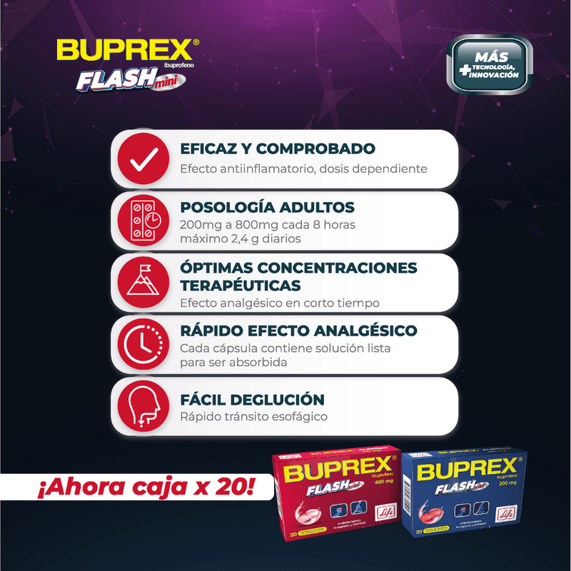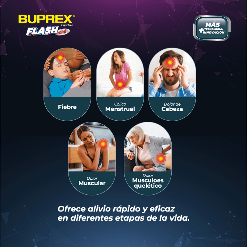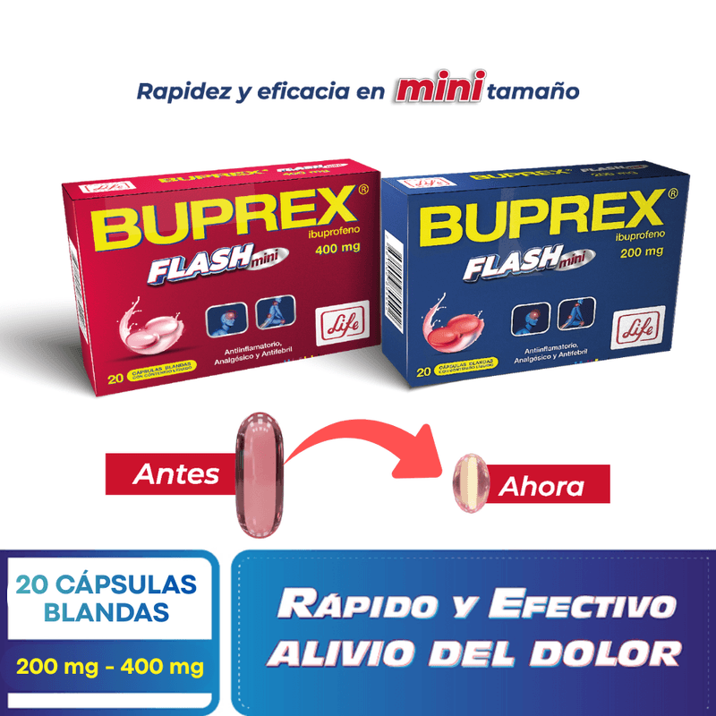 BUPREX FLASH mini 200 mg de ibuprofeno en cápsulas blandas. Indicado para el alivio rápido de dolor y fiebre asociados a procesos inflamatorios o infecciosos. Usos frecuentes: cefalea, dismenorrea, dolor musculoesquelético postraumático o postquirúrgico, dolor dental (incluyendo extracción), fiebre de cualquier origen excepto la causada por dengue.