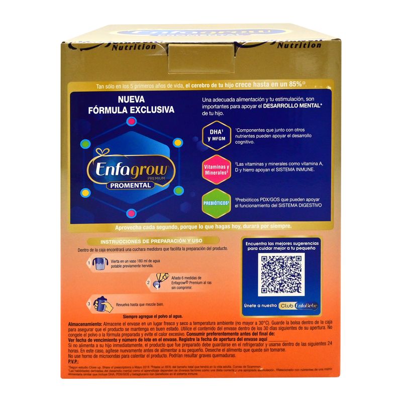 Enfagrow Premium Etapa 3 es un alimento lácteo sabor vainilla para niños en crecimiento con DHA y prebióticos. Apoyan el desarrollo mental. Beneficios: