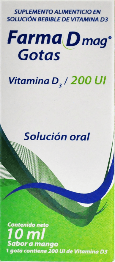 PRINCIPIO ACTIVO: Este suplemento contiene FarmaDmag® Vitamina D3 (Colecalciferol), presentado en un gotero de 10 ml donde cada gota aporta 200 UI de Vitamina D3. INDICACIONES: Es un suplemento alimenticio coadyuvante en patologías asociadas a la hipovitaminosis D, indicado para pacientes con aporte inadecuado, déficit o insuficiencia de Vitamina D, con problemas osteomusculares, mujeres en etapa de gestación, tratamientos de fertilidad, personas con riesgo cardio-metabólico (hipertensión, diabetes, obesidad, síndrome metabólico), interacciones medicamentosas (corticoides, anticonvulsivantes), síndromes malabsortivos (enfermedad inflamatoria intestinal, cirugía bariátrica), como inmunomodulador, en casos de raquitismo y problemas de nutrición. ESPECIFICACIONES (POSOLOGÍA/DOSIFICACIÓN): Para niños, la posología es de 400 UI (2 gotas) a 600 UI (3 gotas) al día o según el criterio médico. CONTRAINDICACIONES: El producto está contraindicado en casos de hipersensibilidad a sus componentes, hipercalcemia, hipercalciuria, nefrolitiasis, hipervitaminosis D y calcificaciones de tejidos (nefrocalcinosis). EFECTOS ADVERSOS / ADVERTENCIAS: Durante el embarazo o lactancia, se debe consultar al médico antes de su uso. No debe usarse si se presentan o se presentaron cálculos renales. No exceda la dosis recomendada y manténgase fuera del alcance de los niños.