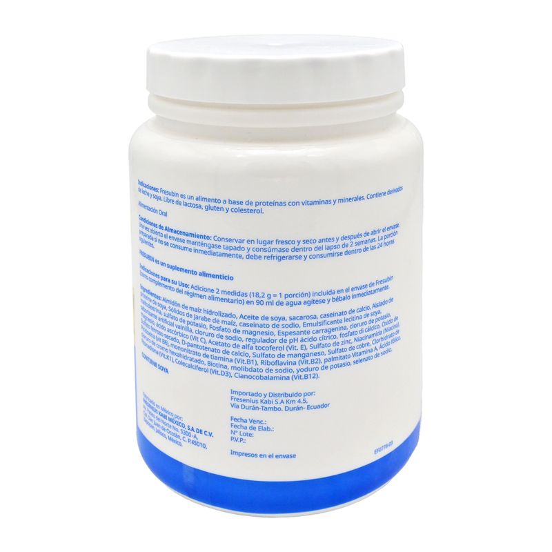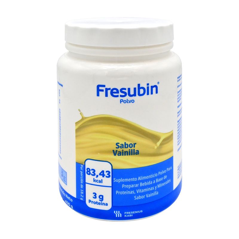 Fresubin Polvo es un suplemento alimenticio en polvo con una composición nutricionalmente completa. INGREDIENTES: Contiene proteínas de alta calidad (caseinato de calcio y aislado de proteína de soya), carbohidratos (almidón hidrolizado de maíz, sacarosa, sólidos de jarabe de maíz, maltodextrina) y lípidos (aceite de soya). Además, está enriquecido con una variedad de vitaminas y minerales esenciales para una nutrición equilibrada. MODO DE USO / RECOMENDACIONES: Este suplemento está diseñado para ser reconstituido con agua. La densidad calórica se puede ajustar a 1 kcal/ml mezclando 54.6 g (6 medidas) de polvo con 200 ml de agua purificada, pero para una mezcla más homogénea, se recomienda usar una licuadora. Puede ser administrado por vía oral o por sonda. Se sugiere de una a tres porciones al día como suplemento, pero como fuente única de alimentación, se debe consultar a un profesional de la salud. INDICACIONES: Es un suplemento nutricional indicado para adultos con desnutrición o en riesgo de padecerla. Es ideal para pacientes con pérdida de peso, problemas de masticación o deglución, pérdida de apetito, o para complementar la dieta en casos de trastornos de la función intestinal o durante el postoperatorio. CONTRAINDICACIONES: Se debe evitar su uso en personas con alergia a la proteína de la leche de vaca. No es apropiado para niños menores de un año. Se recomienda consultar a un profesional de la salud antes de su consumo.