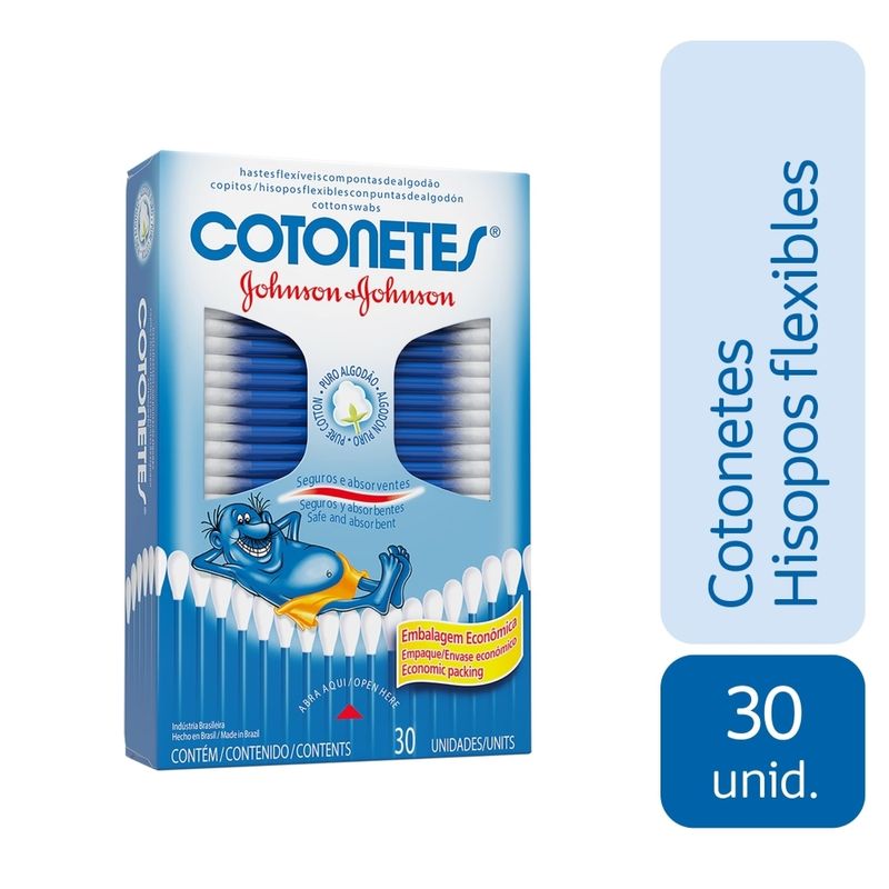 Cotonetes® JOHNSON'S® son hechos con algodón 100% puro y el material del palillo es flexible. Por esto ofrecen toda la suavidad, comodidad y absorción para el cuidado de su piel. Sus puntas resistentes de algodón no desprenden fibras, ya que contienen ranuras que permiten una fijación segura e higiénica. Son indicados para la higiene personal de toda la familia.