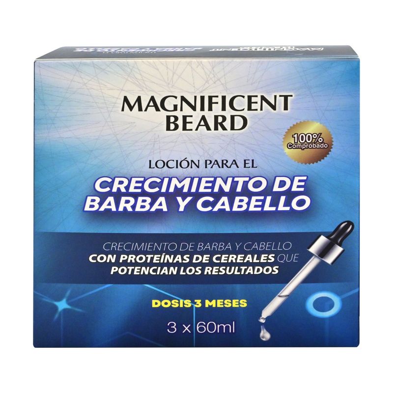 ESPECIFICACIONES: Esta loción está diseñada para el crecimiento tanto de la barba como del cabello. La caja incluye tres frascos de 60 ml o un tratamiento total para tres meses. Por su formato en gotero, se recomienda generalmente aplicar unas gotas directamente en la piel o cuero cabelludo en las zonas deseadas, masajeando suavemente para una mejor absorción. INDICACIONES O CONTRAINDICACIONES: Este producto está indicado para hombres que buscan estimular, rellenar o potenciar el crecimiento del vello facial (barba) y/o capilar (cabello), especialmente en zonas con poco crecimiento o densidad. No es un medicamento, por lo que no tiene una dosificación farmacéutica o efectos secundarios sistémicos, aunque cualquier producto de aplicación tópica puede causar una reacción de hipersensibilidad (enrojecimiento, picazón) en personas sensibles a alguno de sus componentes. Es fundamental realizar una prueba en una pequeña zona antes de usarlo de manera regular. PRINCIPIO ACTIVO: El ingrediente clave y diferenciador que se destaca en el empaque es la inclusión de Proteínas de Cereales que potencian los resultados del crecimiento.