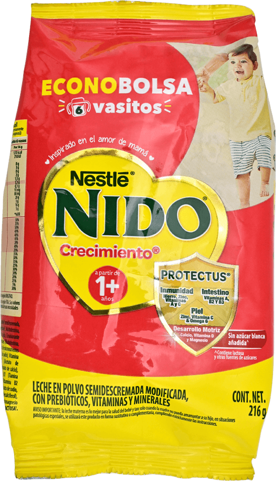 NIDO 1+ Stand Pack 216 g es una leche en polvo semidescremada diseñada para niños desde 1 año. Enriquecida con Protectus, vitaminas, minerales y prebióticos que ayudan a fortalecer la inmunidad, apoyar la digestión, el desarrollo motriz y el cuidado de la piel. Práctica presentación económica.