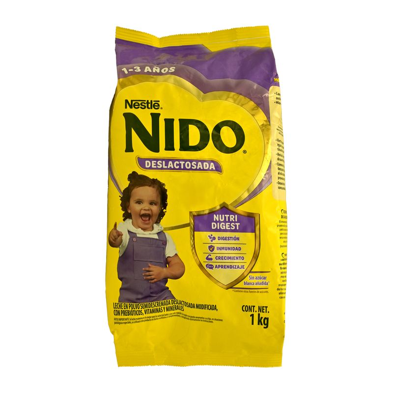 NIDO® Deslactosada es una leche de crecimiento para niños a partir de un año de edad con intolerancia a la lactosa, que contiene PREBIO1® (prebióticos) que fortalecen el sistema digestivo, vitaminas A