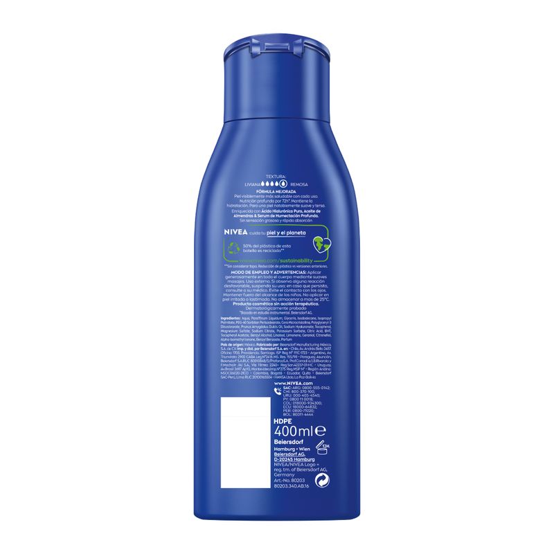 Nutre intensamente la piel seca gracias al aceite de almendras y glicerina. Hidrata hasta por 72h. Modo de uso: aplicar diariamente en todo el cuerpo, especialmente después del baño.