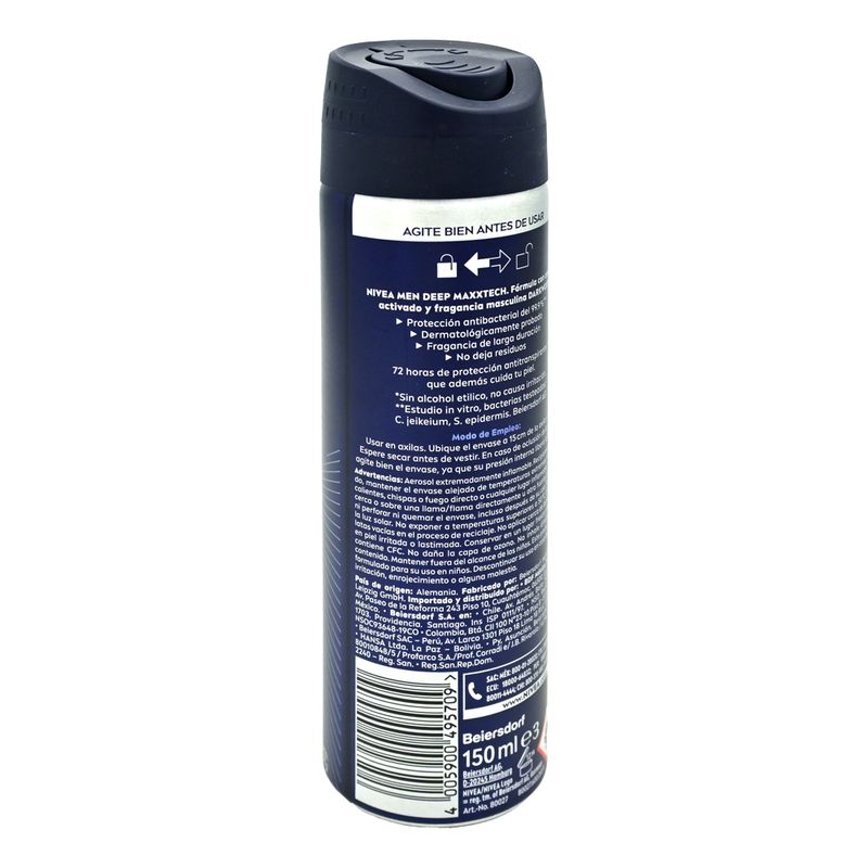 NIVEA Men Deep 72H 150 ml: antitranspirante en spray con carbón negro, fragancia Darkwood y protección intensa hasta 72 h para frescura y control del olor duradero.