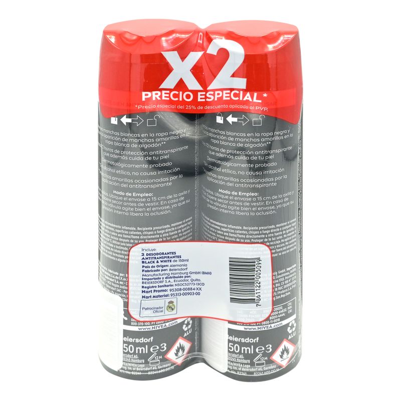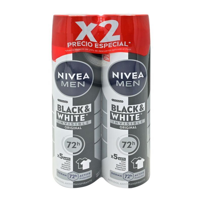 Desodorante antitranspirante en aerosol para hombres con tecnología Black & White Invisible, formulado para brindar hasta 72 horas de protección eficaz contra el sudor y el mal olor, ayudando a evitar marcas blancas en la ropa negra y manchas amarillas en la ropa blanca. Su fragancia fresca y masculina proporciona una sensación de limpieza y frescura prolongada, ideal para el uso diario del hombre activo.