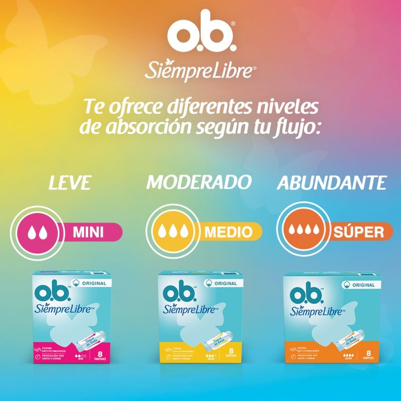 Ob Tampones Medio, en un práctico paquete de 8 unidades, están diseñados para proporcionar una protección confiable y cómoda durante el período menstrual. Con una capacidad absorbente adecuada para un flujo moderado, estos tampones ofrecen una sensación de seguridad y frescura durante todo el día.