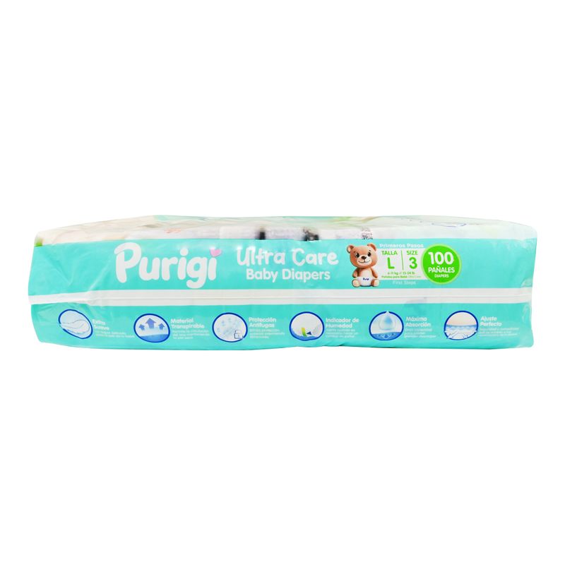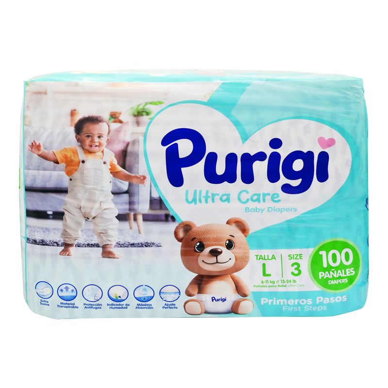Purigi Pañal Infantil Ultra Care Diapers L-3 ofrece equilibrio perfecto entre absorción, suavidad y ajuste. Mantiene la piel seca con su núcleo absorbente, evitando filtraciones y molestias. Con materiales suaves y diseño cómodo, brinda protección prolongada para el bebé, permitiendo movilidad y bienestar tanto de día como de noche.