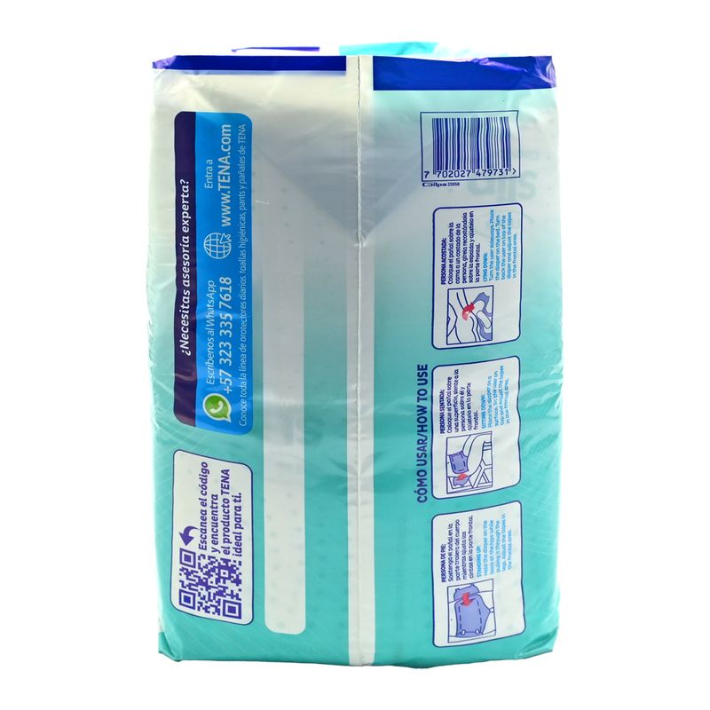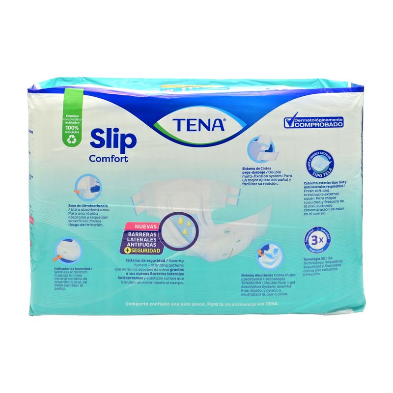 ¡Nueva Imagen! ANTES: TENA Slip Clásico. Pañal para hombres y mujeres con incontinencia fuerte, con ninguna o poca capacidad de movimiento y dependientes de un cuidador. Ahora con nuevas barreras laterales antiderrames que evita los escapes de orina, con elásticos curvos que brindan un mejor ajuste al cuerpo. Además cuenta con TECNOLOGÍA 3x que brinda sequedad, seguridad y suavidad con la piel, evitando irritación y TECNOLOGÍA TENASORB que absorbe más rápido y ayuda a neutralizar el olor a orina. Nuevo Indicador de Humedad, línea central que pasa de amarillo a azul cuando se debe de cambiar el pañal. *Vs. TENA Slip Clásico .