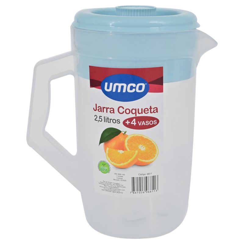 Disfruta tus bebidas favoritas con el set Umco Jarra Coqueta de 2.5 litros y 4 vasos incluidos. Fabricado en plástico resistente, ligero y libre de BPA, es ideal para uso diario en el hogar, picnics o reuniones. Su diseño ergonómico facilita el vertido sin derrames, mientras que los vasos combinan perfectamente para una presentación uniforme. Fácil de lavar y almacenar, este set es práctico, duradero y funcional para toda ocasión. Disponible en colores surtidos.